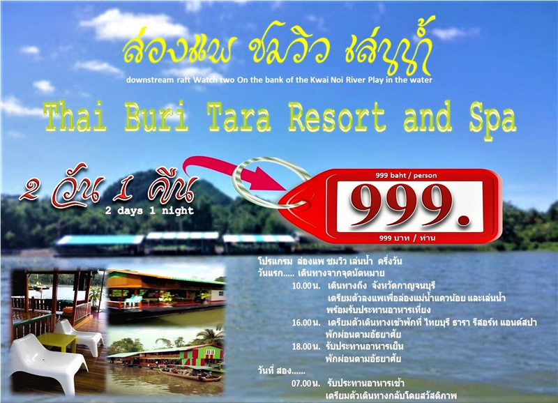 ชื่อโปรแกรม :ล่องแพ ชมวิว เล่นน้ำ 2 วัน 1 คืน สถานที่ :ไทยบุรี ธารา รีสอร์ท แอนด์ สปา กาญจนบุรี